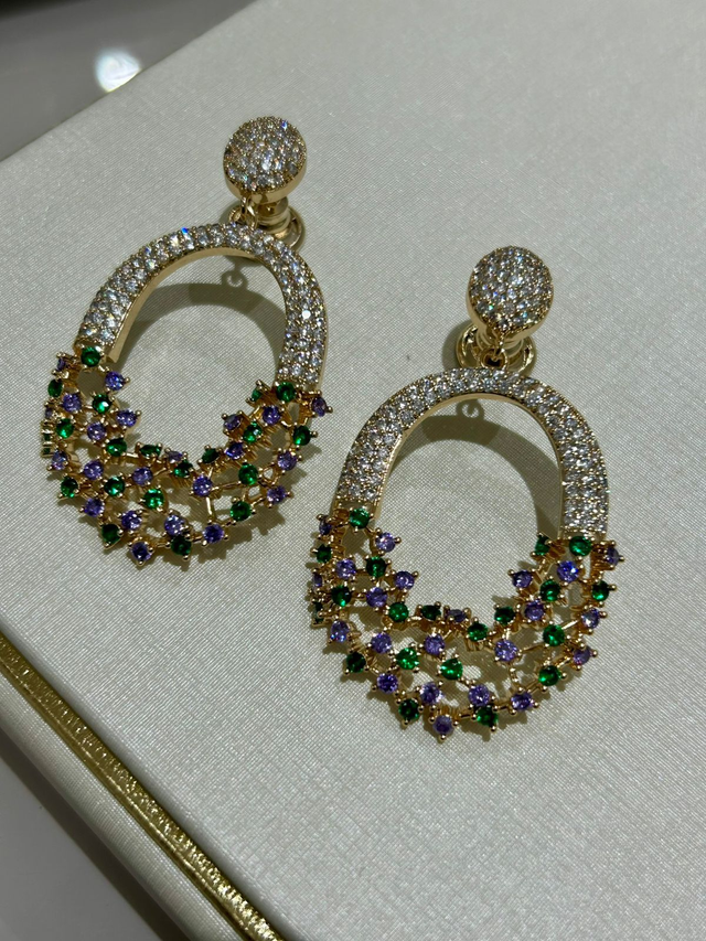 BRINCO CRAVAÇÃO CHUVA DE PRATA LAVANDA E ESMERALDA OURO 18K CRISTAL